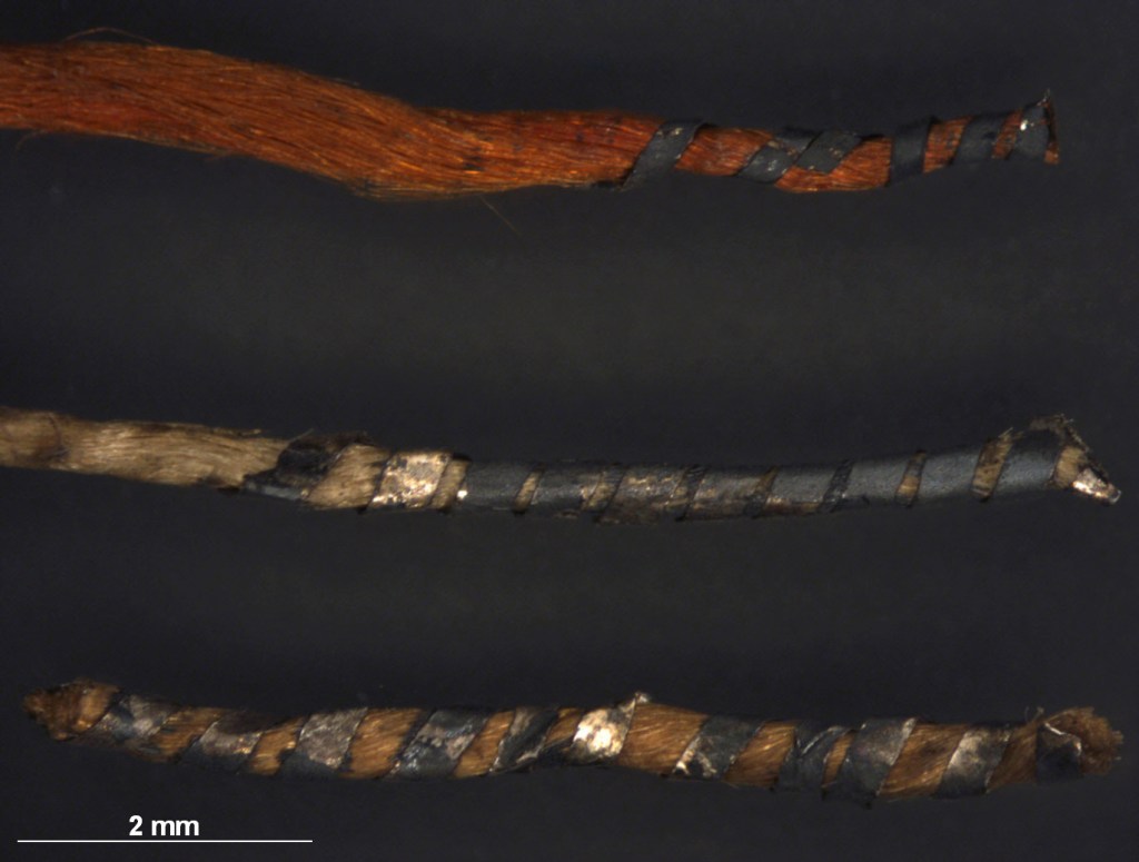 À gauche : Fils métalliques dorés et argentés enroulés autour d’une âme en soie. Le fil du bas est de couleur jaune orangé, réalisée à partir de bois de sappan | À droite : la couleur beige / jaune provient de la cochenille.