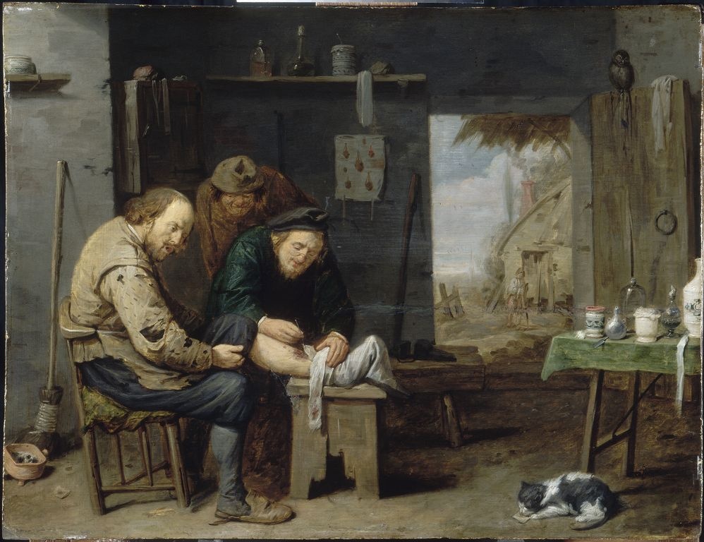 David Ryckaert III est un Anversois spécialisé dans la scène de genre. Fortement inspiré par Adriaen Brouwer, ses personnages ont des physionomies souvent très grotesques, comme celui du fond. Toutefois, le chirurgien présente ici une mine plutôt avenante et donne l’impression de se concentrer sur son travail, bien que sa minutie paraisse insuffisante au vue de la douleur exprimée par le patient. Sans être vraiment réaliste (la vaisselle paraît beaucoup trop riche), cette oeuvre donne une image assez neutre de chirurgien.