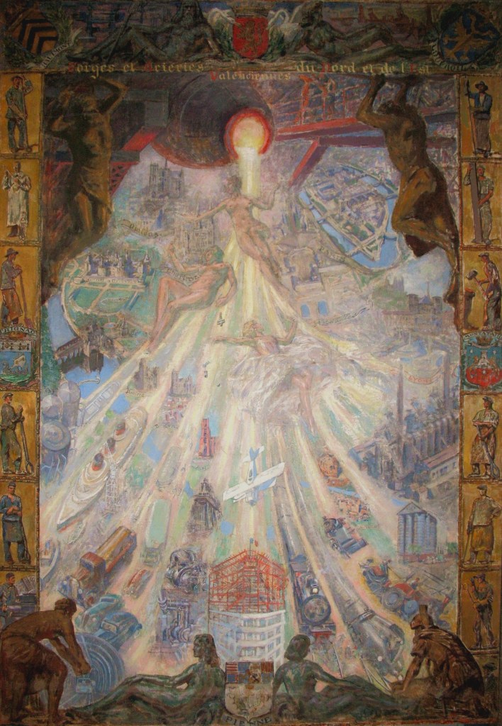 Le tableau allégorique commandé par la direction d’une grosse entreprise sidérurgique représente une coulée d’acier valenciennois irriguant toute la France, patrimoniale et métallurgique. Dans ses marges, les métiers indispensables à cette activité sont représentés en médaillons, dont celui du scientifique.