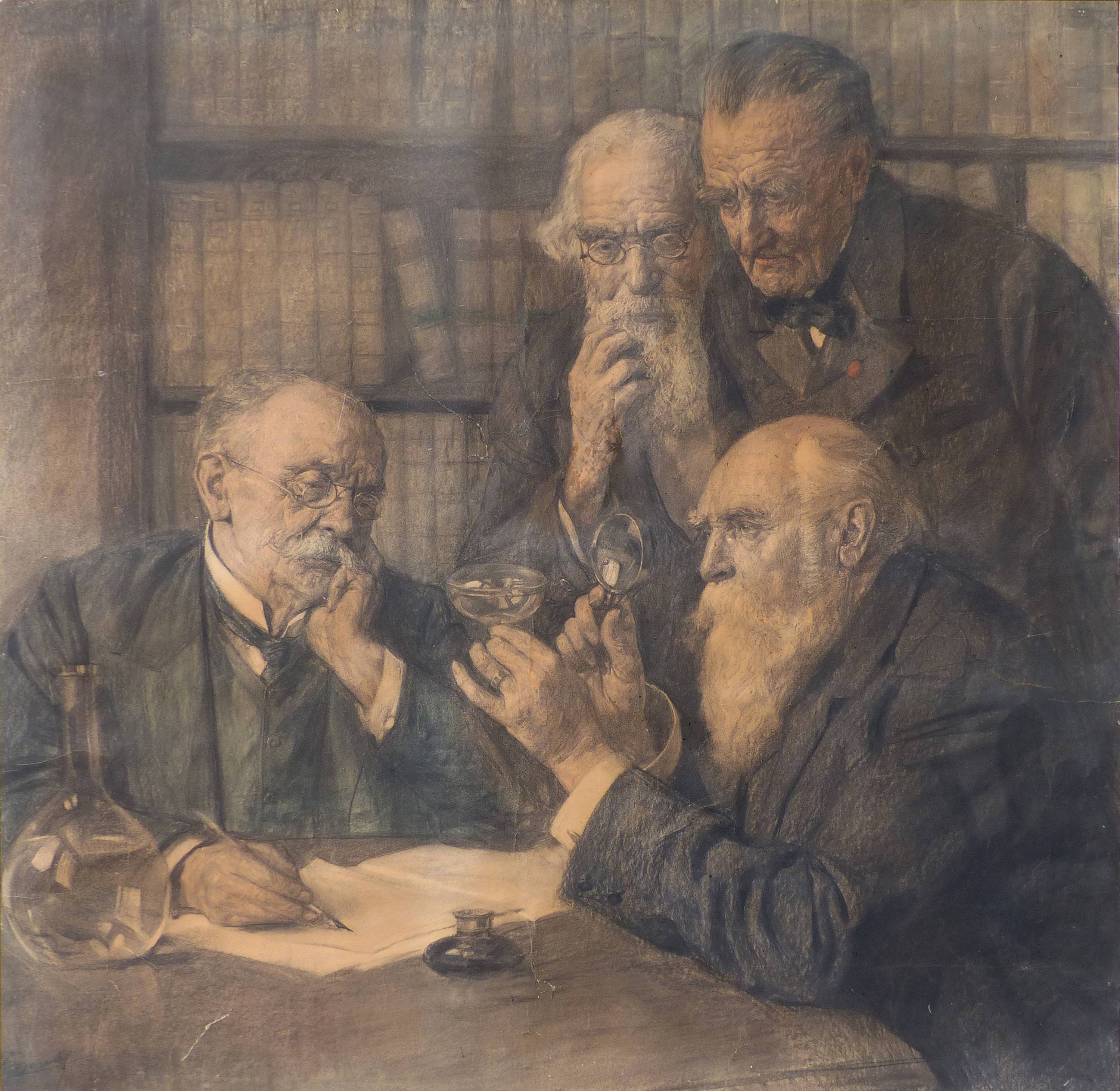 Lucien Jonas (1880-1947), Savants, 1912, dessin au fusain rehaussé à la craie sur papier marouflé sur toile, H.113,5 cm x L.116,5 cm, Denain, Musée d’archéologie et d’histoire locale. © Germain Hirselj / Communauté d’Agglomération de La Porte du Hainaut