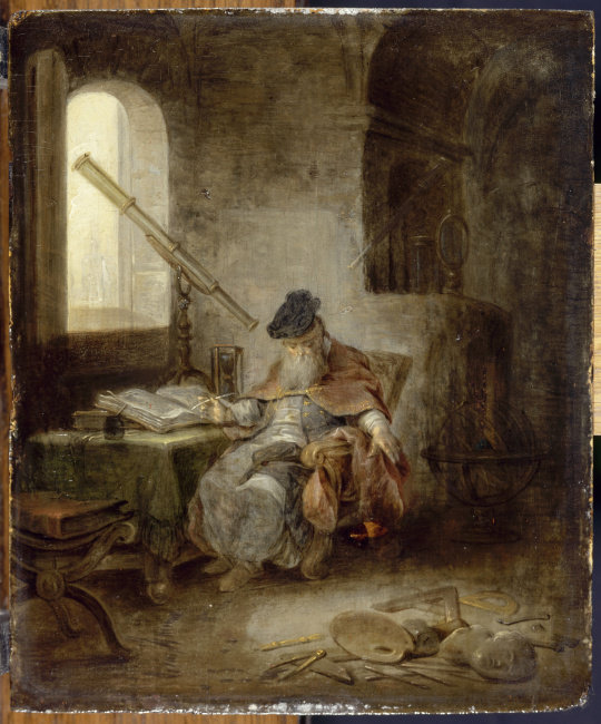 Transposition du philosophe antique ou du magicien, le savant est dès la Renaissance incarné par un homme âgé et barbu, comme en témoigne L’Hermogène de Jérôme Bosch (v. 1450-1516), mais il s’en différencie souvent par des outils ou des documents : par exemple, le télescope et les instruments de mesure de l’astrologue de François Eisen (1685-v. 1778).